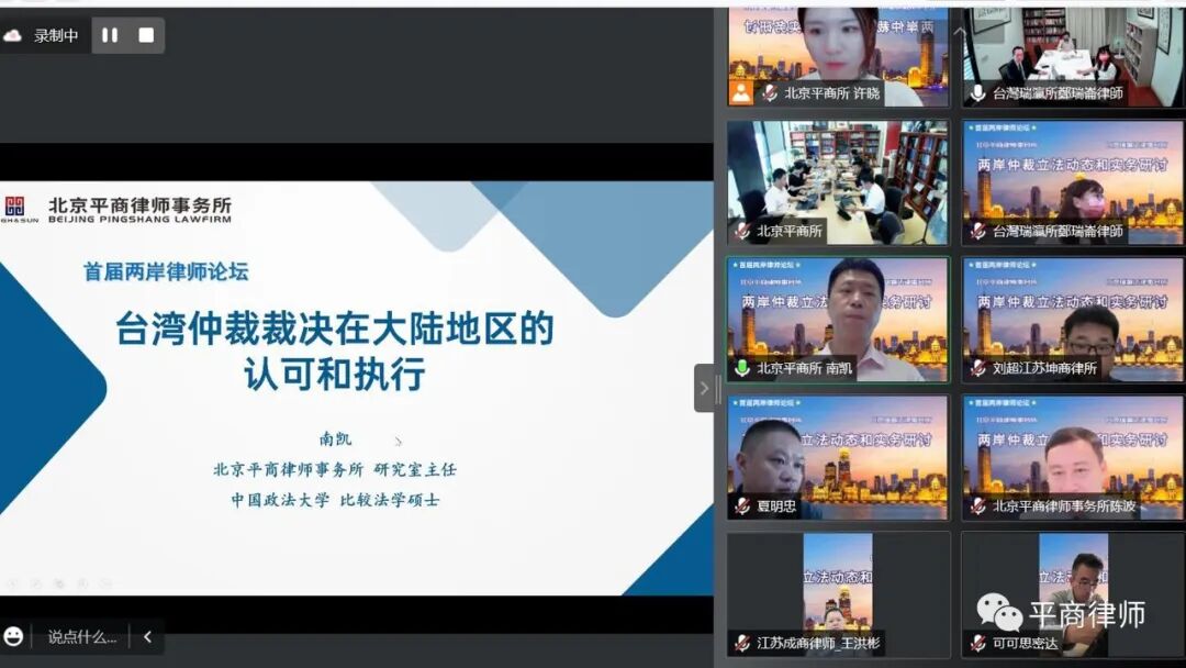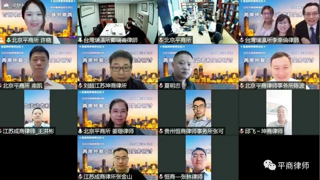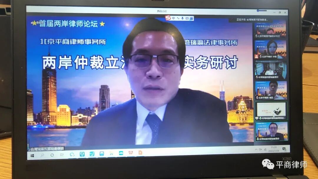2022年7月26日上午,北京平商律师事务所与台湾瑞瀛法律事务所共同举办的首届两岸律师论坛在腾讯会议线上举办。北京平商律师事务所、台湾瑞瀛法律事务所、贵州恒商律师事务所、江苏坤商律师事务所、江苏成商律师事务所参加。本次论坛由北京平商律师事务所律师助理、中国人民大学法律硕士许晓主持。