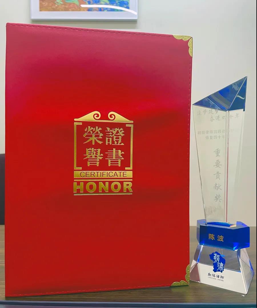 北京平商律师事务所主任陈波律师收到朝阳区律师行业党委、朝阳区律师协会颁发的“重要贡献奖”荣誉证书及奖杯。