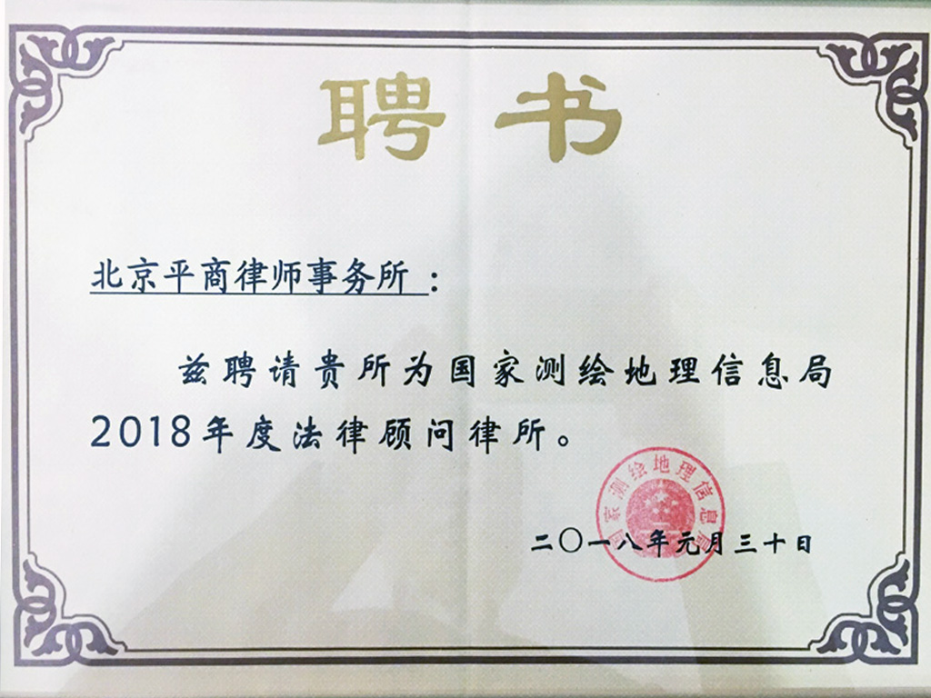北京平商律师事务所受聘国家测绘地理信息局2018年度法律顾问律所