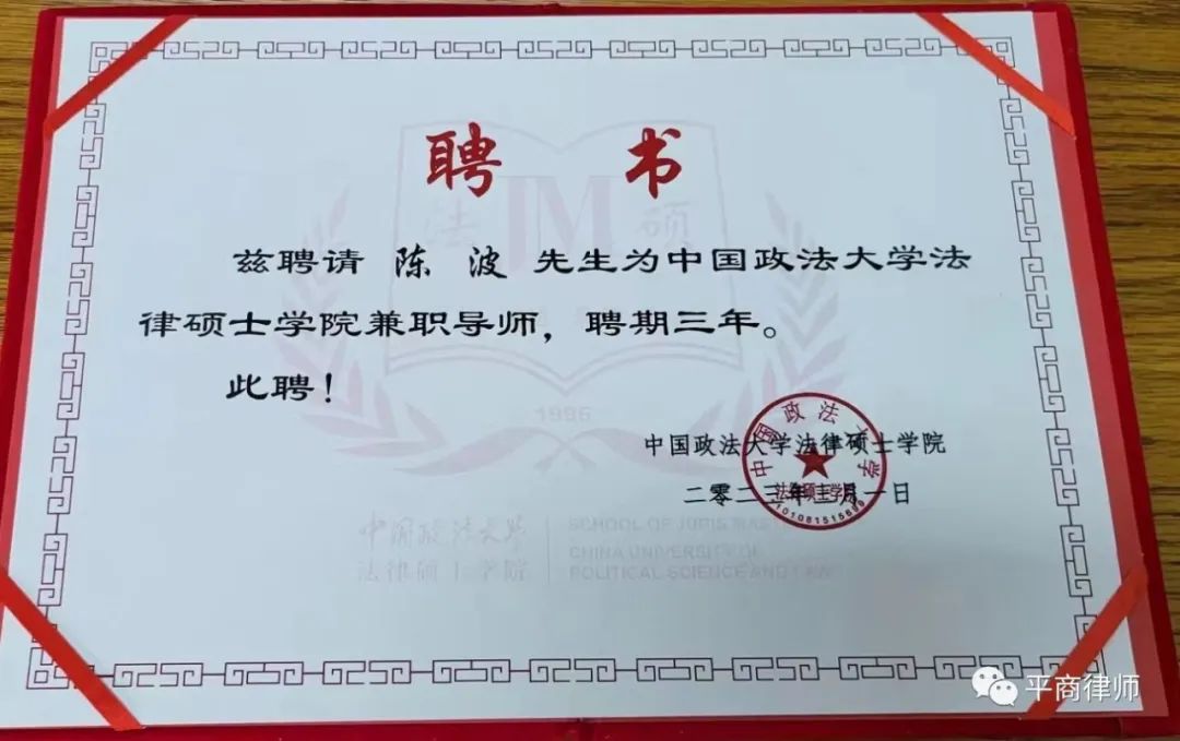 北京平商律师事务所主任陈波律师续聘为中国政法大学法律硕士学院兼职导师,聘期三年,自2023年3月至2026年3月。